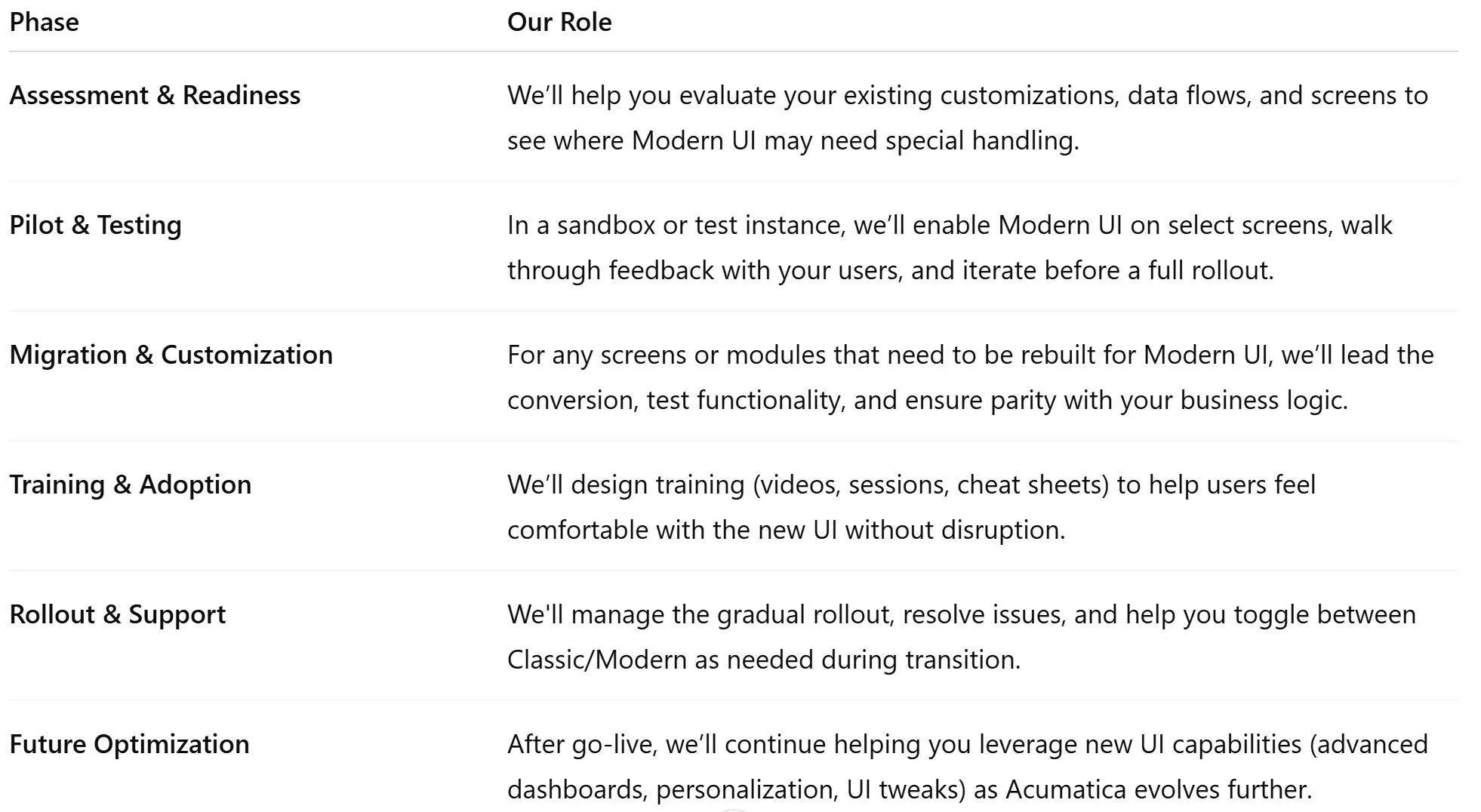 The Modern UI in Acumatica 2025 R2 represents a turning point — a gradual but meaningful shift toward a more user-centric, flexible, and modern ERP experience. The goal is to make your workflows feel lighter, faster, and more intuitive — while the heavy lifting happens behind the scenes.